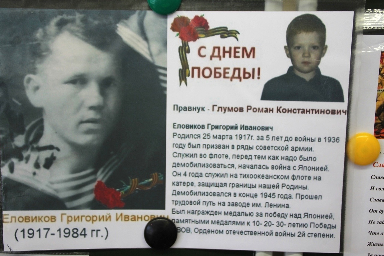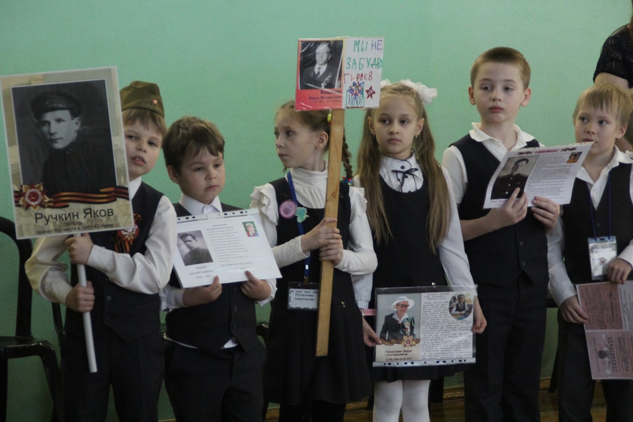 Спасибо юнармейцам Павлу Рыкову, Ксении Ильчишиной, Регине Рахматуллиной и Никите Зубенину за помощь в проведении этого важного школьного события!Все больше и больше времени проходит с той святой, для Всех Россиян, даты - 9 мая 1945 года... Всё дальше и дальше события военных лет... И тем приятнее видеть, что в российских семьях чтят память о родных и близких людях, которые прошли военными дорогами, трудились на заводах и колхозных полях. Маленьким россиянам мамы и папы рассказывают уже о своих дедушках и бабушках. Из поколения в поколение передаются рассказы о людях, отдававших жизни за то, чтобы мы жили, учились, работали под мирным голубым небом.